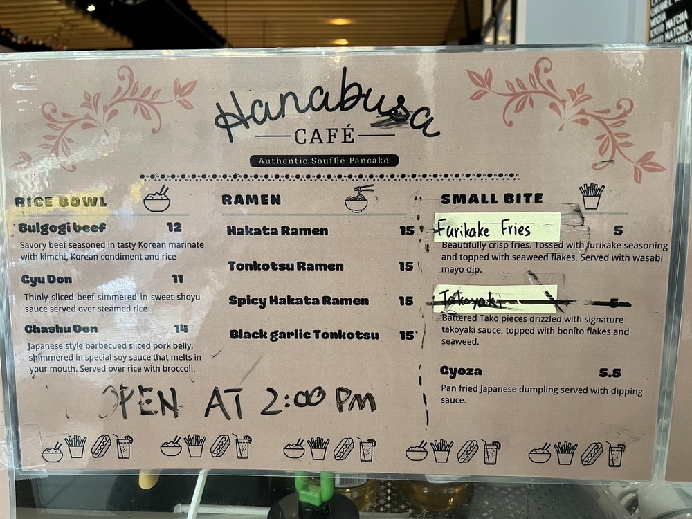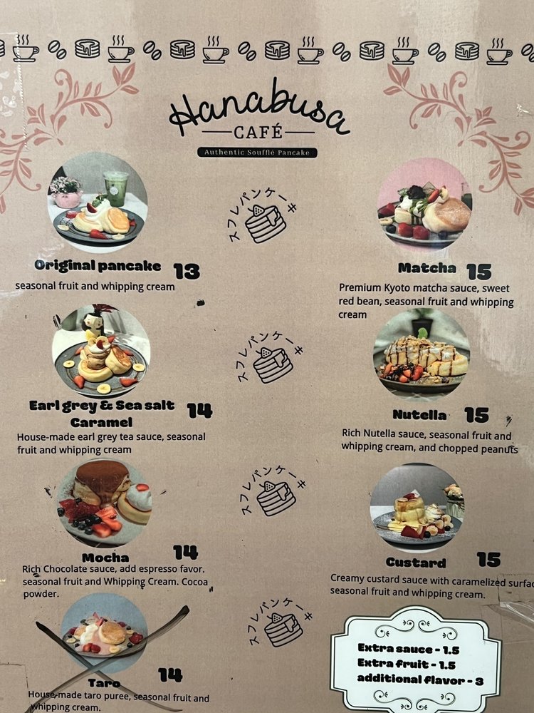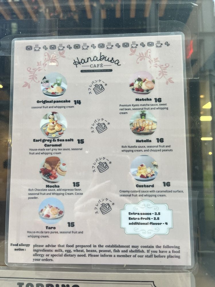 Hanabusa Cafe in Chicago offers a casual and trendy dining experience with a focus on Japanese soufflé pancakes, known for their light and fluffy texture. The menu features a variety of classic teas, iced cheese teas, and iced fresh fruit teas, as well as matcha lattes. The café has a limited vegetarian options and is not ideal for large groups. Customers appreciate the friendly service and quaint ambiance of the restaurant. Highlights include the Nutella pancakes and taro soufflé pancakes with flavorful toppings. The café's location near popular attractions makes it a perfect spot for a date or a quick bite while exploring the city. Overall, Hanabusa Cafe stands out for its unique menu offerings and inviting atmosphere.